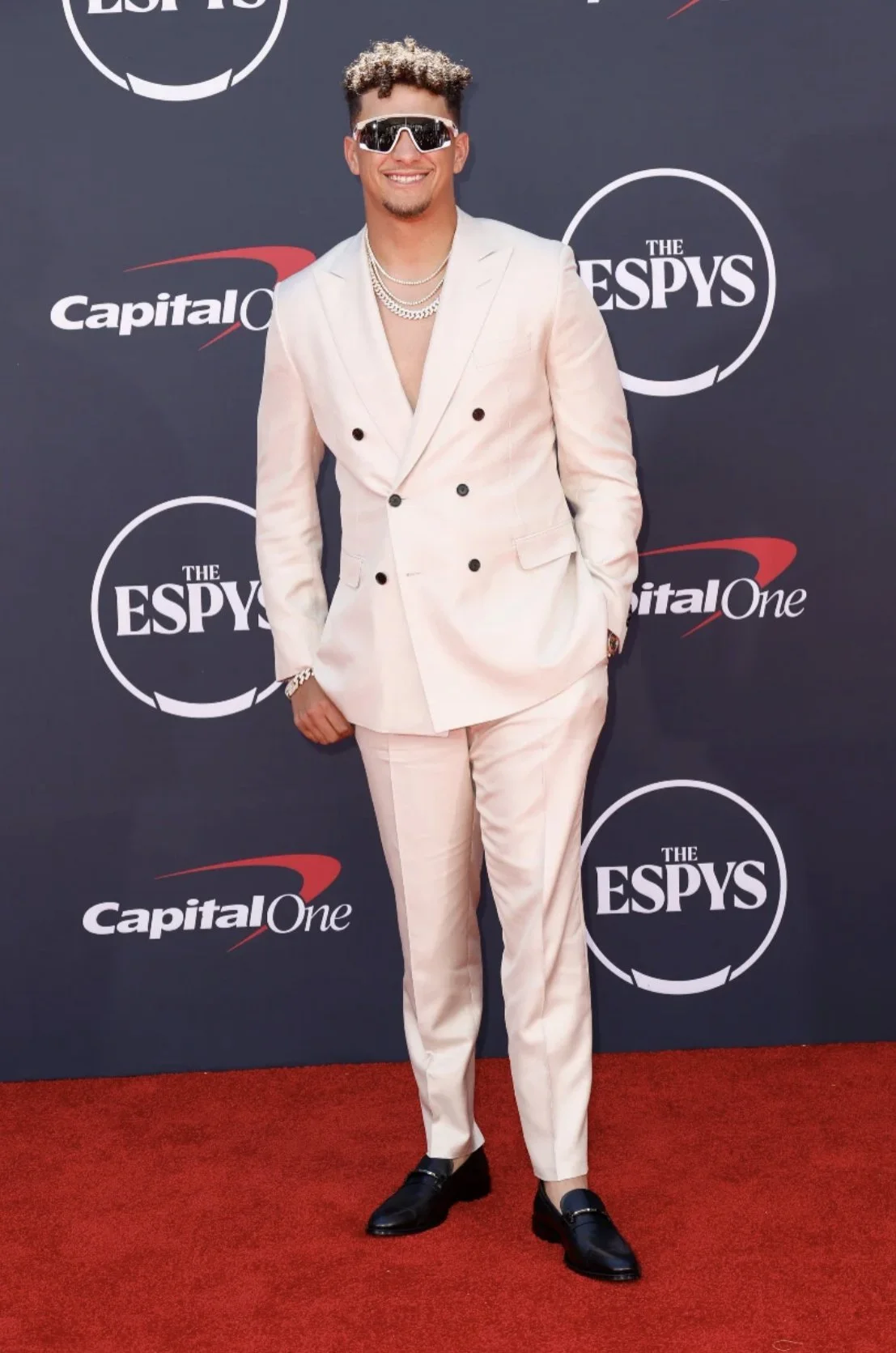 2) Patrick Mahomes. The 2x Superbowl champion graced the carpet in a double-breasted tan suit, some chains, and his trademark Oakley sunglasses. Mahomes didn’t have to do much to steal the show.